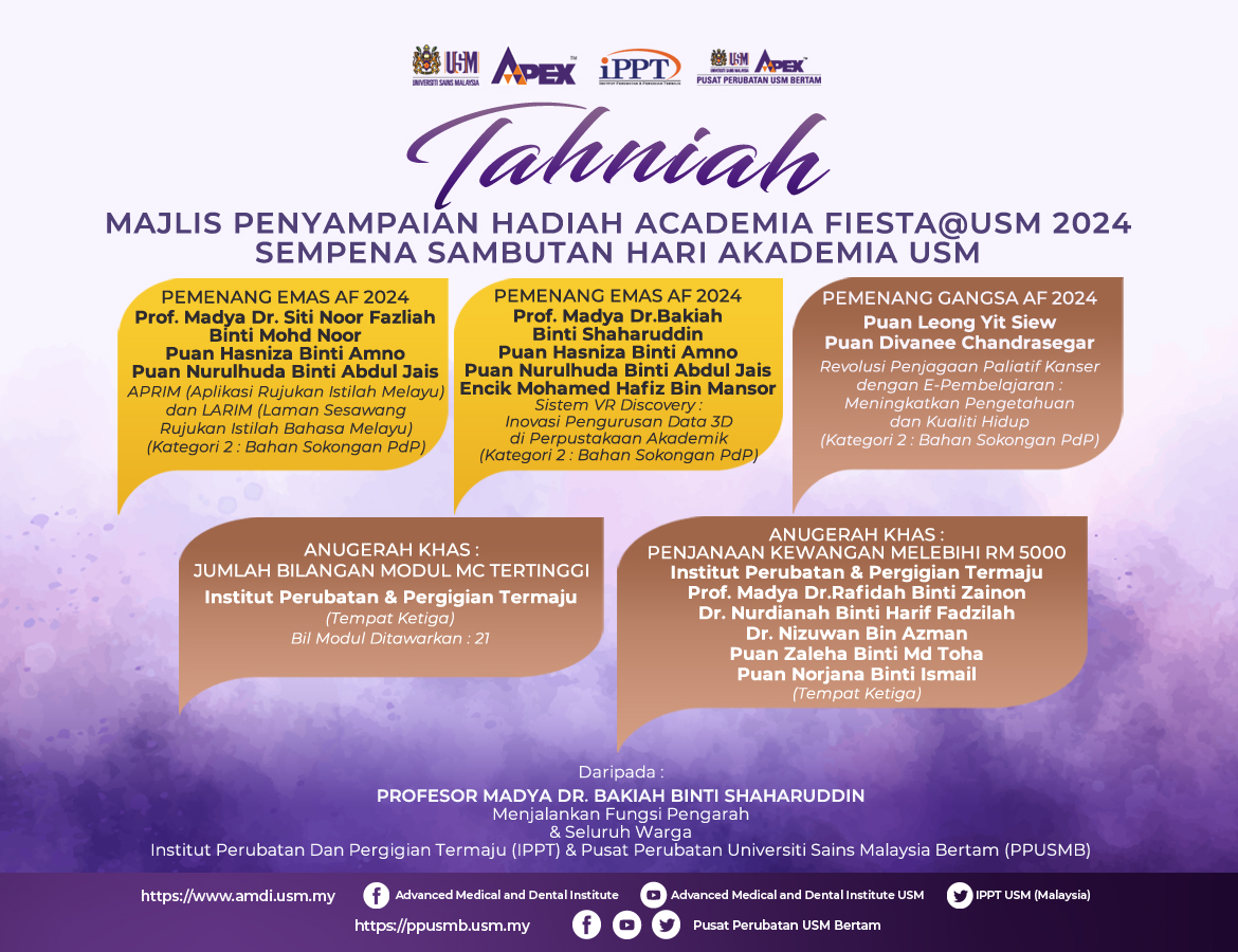 Setinggi-tinggi tahniah diucapkan daripada Pengarah dan seluruh warga IPPT dan PPUSMB kepada semua pemenang. Pengarah turut menyeru supaya staf akademik dan staf lain sama-sama berganding bahu untuk menghasilkan lebih banyak kandungan dan produk inovasi dalam pengajaran & pembelajaran.