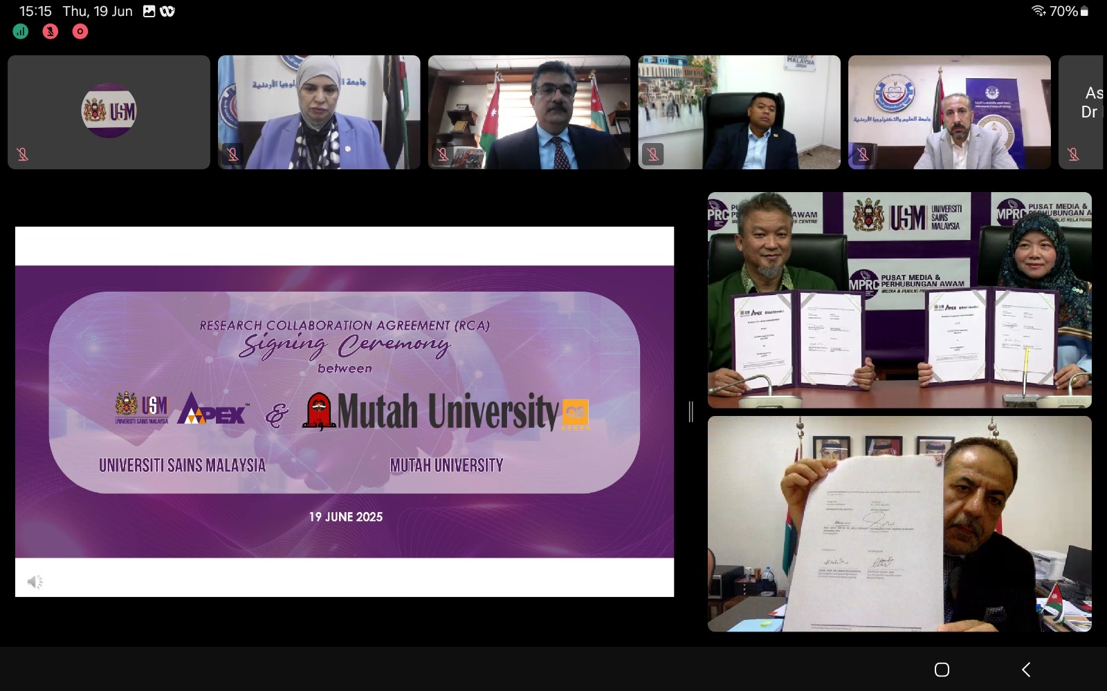 Turut hadir dalam majlis secara maya ini ialah Naib Presiden JUST, Profesor Dr. Muna A. Abu-Dalo; Naib Presiden Hal Ehwal Kolej Sains, Mutah University, Profesor Dr. Amin Aqel; Dekan Penyelidikan Saintifik, The University of Jordan, Profesor Dr. Yaser Rayyan; Dekan, Pusat Pengajian Sains Perubatan USM, Profesor Dr. Kamarul Aryffin Baharuddin; Pengarah, Institut Perubatan dan Pergigian Termaju (IPPT), USM, Profesor Madya Dr. Bakiah Shaharuddin; wakil dari Kedutaan Besar Malaysia di Amman, Jordan dan para penyelidik dari JUST, Mutah University, The University of Jordan dan USM.