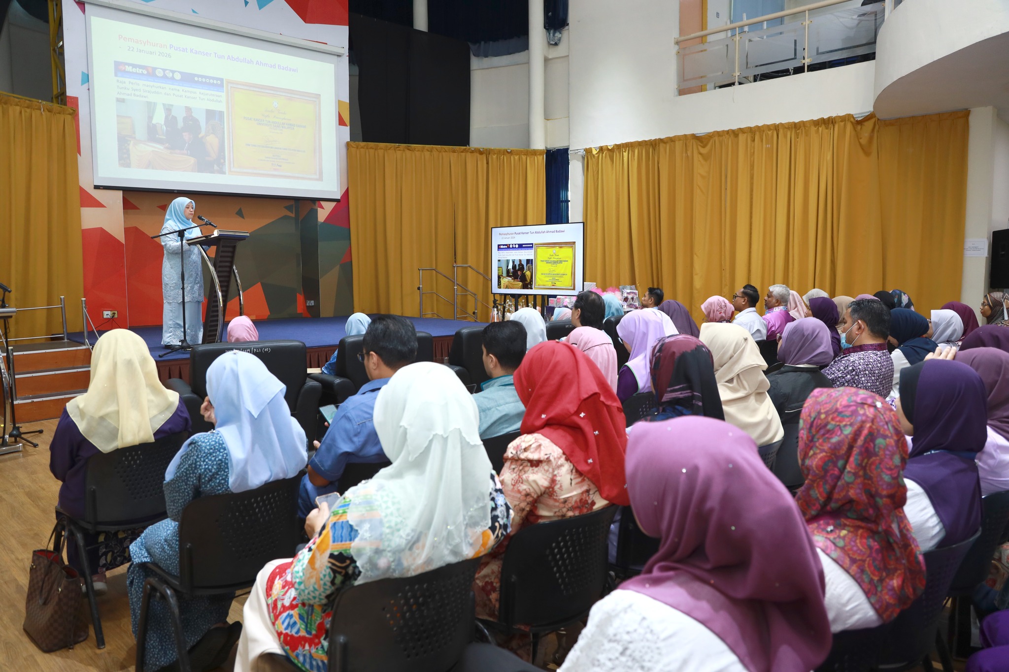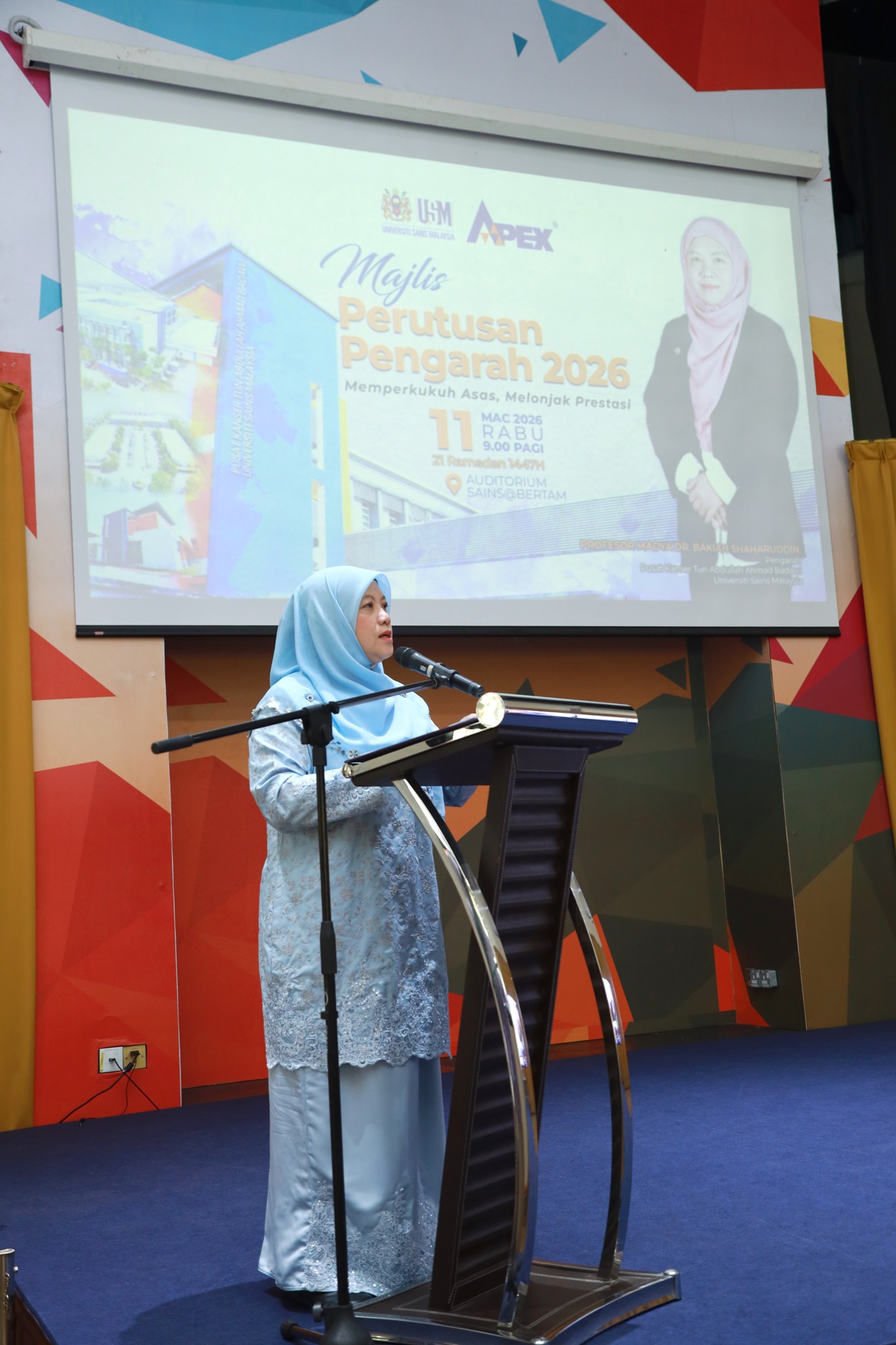 KEPALA BATAS, PULAU PINANG, 11 Mac 2026: Warga Pusat Kanser Tun Abdullah Ahmad Badawi (PKTAAB), Universiti Sains Malaysia berhimpun bagi mendengar Perutusan Pengarah 2026 yang disampaikan oleh Pengarah PKTAAB, Prof. Madya Dr. Bakiah Shaharuddin dalam satu majlis yang berlangsung di dewan Auditorium Sains@Bertam dalam suasana Ramadan yang penuh bermakna.